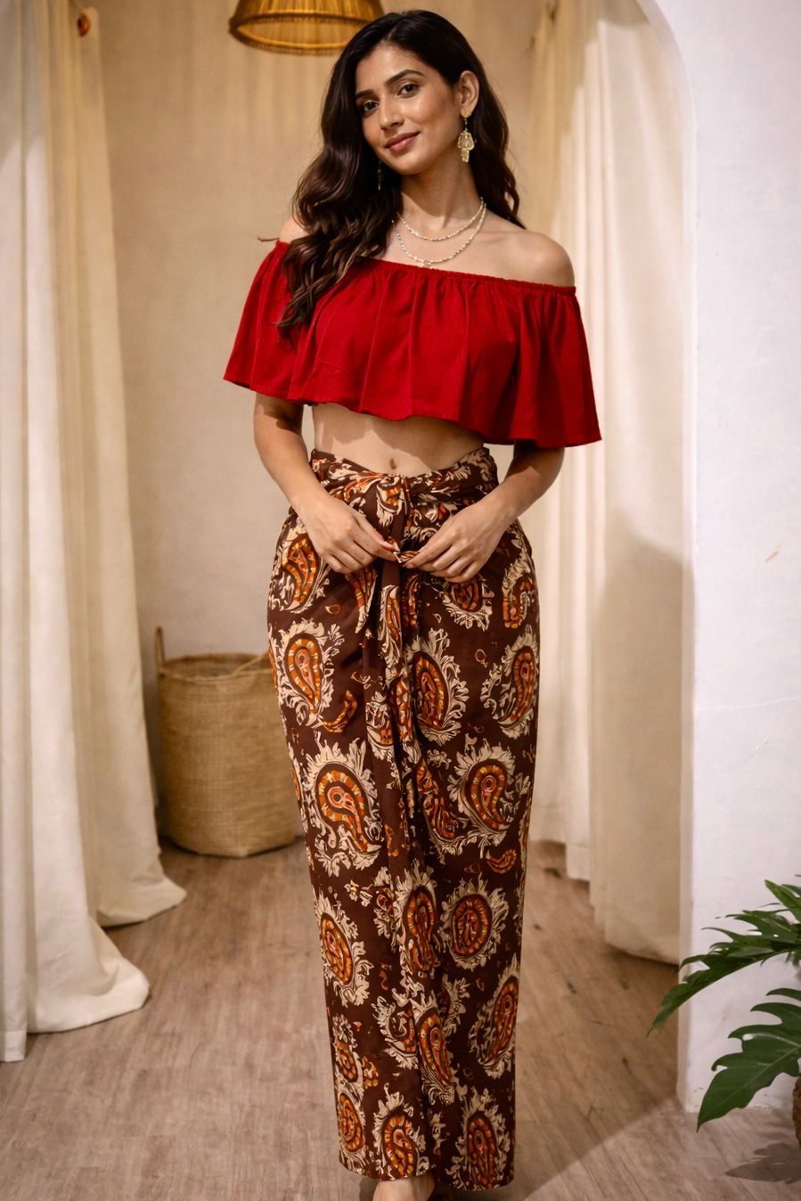 Color & Style –Orange & brown ( Wrap lungi with stretchy top)